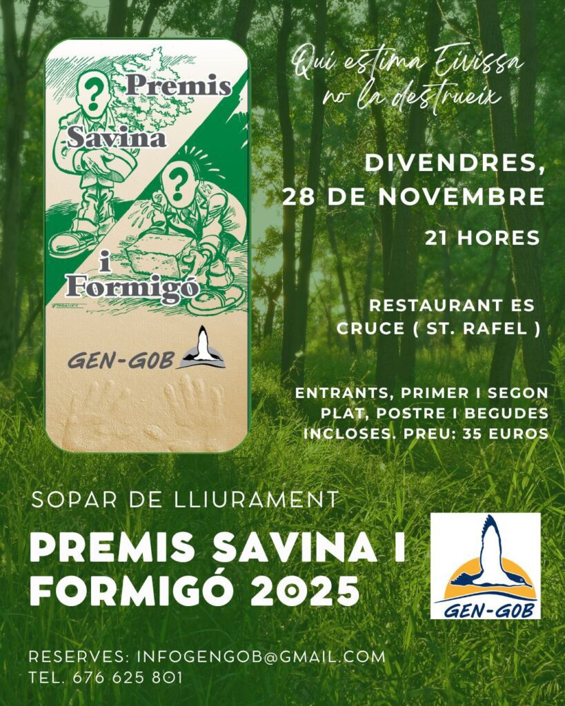El Grup d’Estudis de la Naturalesa (GEN-GOB) ha anunciado el regreso de sus tradicionales Premis Savina i Formigó, galardones que reconocen anualmente a personas o colectivos que se distinguen por su compromiso con la defensa del medio ambiente y la cultura de Ibiza, así como a quienes, por el contrario, contribuyen a su deterioro.
