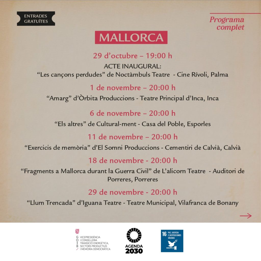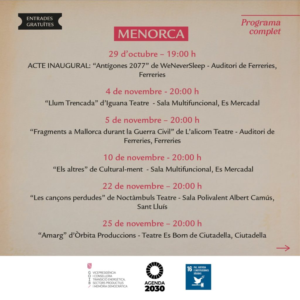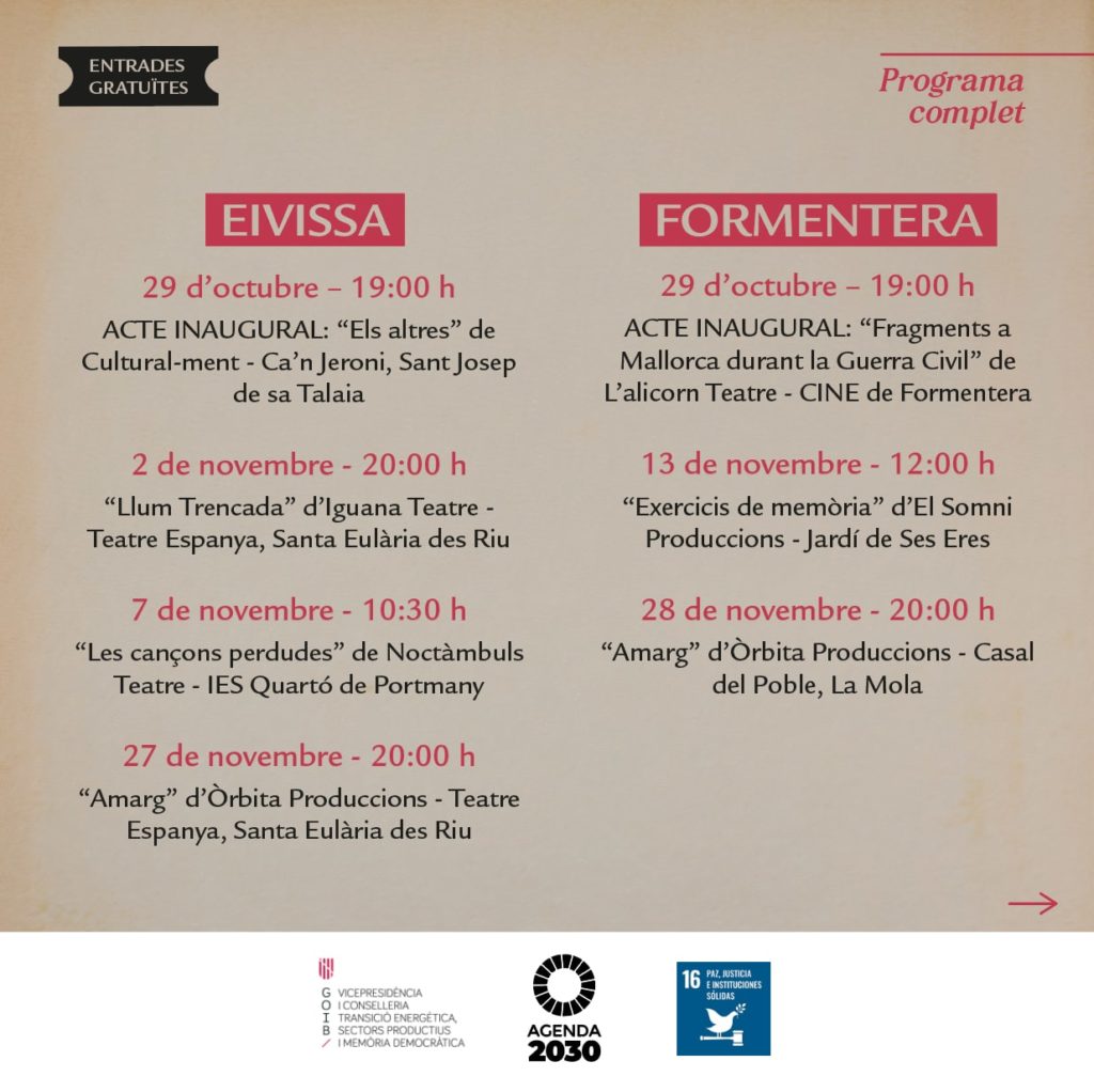 La Vicepresidència i Conselleria de Transició Energètica, Sectors Productius i Memòria Democràtica del Govern, a través de la Direcció General de Memòria Democràtica, organitza el primer cicle «Teatre per a la Memòria», amb motiu del Dia del Record, que se celebrarà el 29 d’octubre.