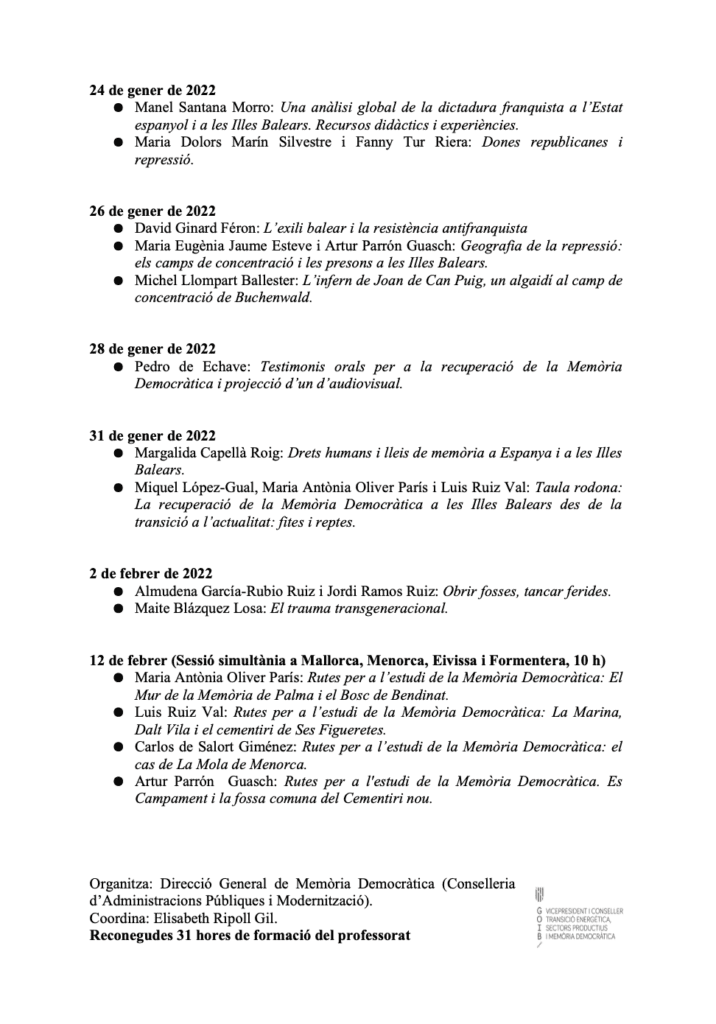 La proposta formativa, que s’ofereix en una modalitat mixta —virtual per a totes les Illes i presencial, segons aforament, en el Centre de Professorat de Palma—, és fruit de la feina desenvolupada per un grup de treball creat des de les comissions de Fosses i de Memòria Democràtica de les Illes Balears, coordinat per la doctora en història Elisabeth Ripoll Gil. Compta també amb la col·laboració de la Conselleria d’Educació i Formació Professional, a través de la Direcció General de Primera Infància, Innovació i Comunitat Educativa.