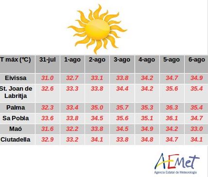 En el resto de la Península y en Baleares es probable que se alcancen los 35 grados, con la excepción del área cantábrica y zonas del litoral sureste y del mar de Alborán, según la Aemet.