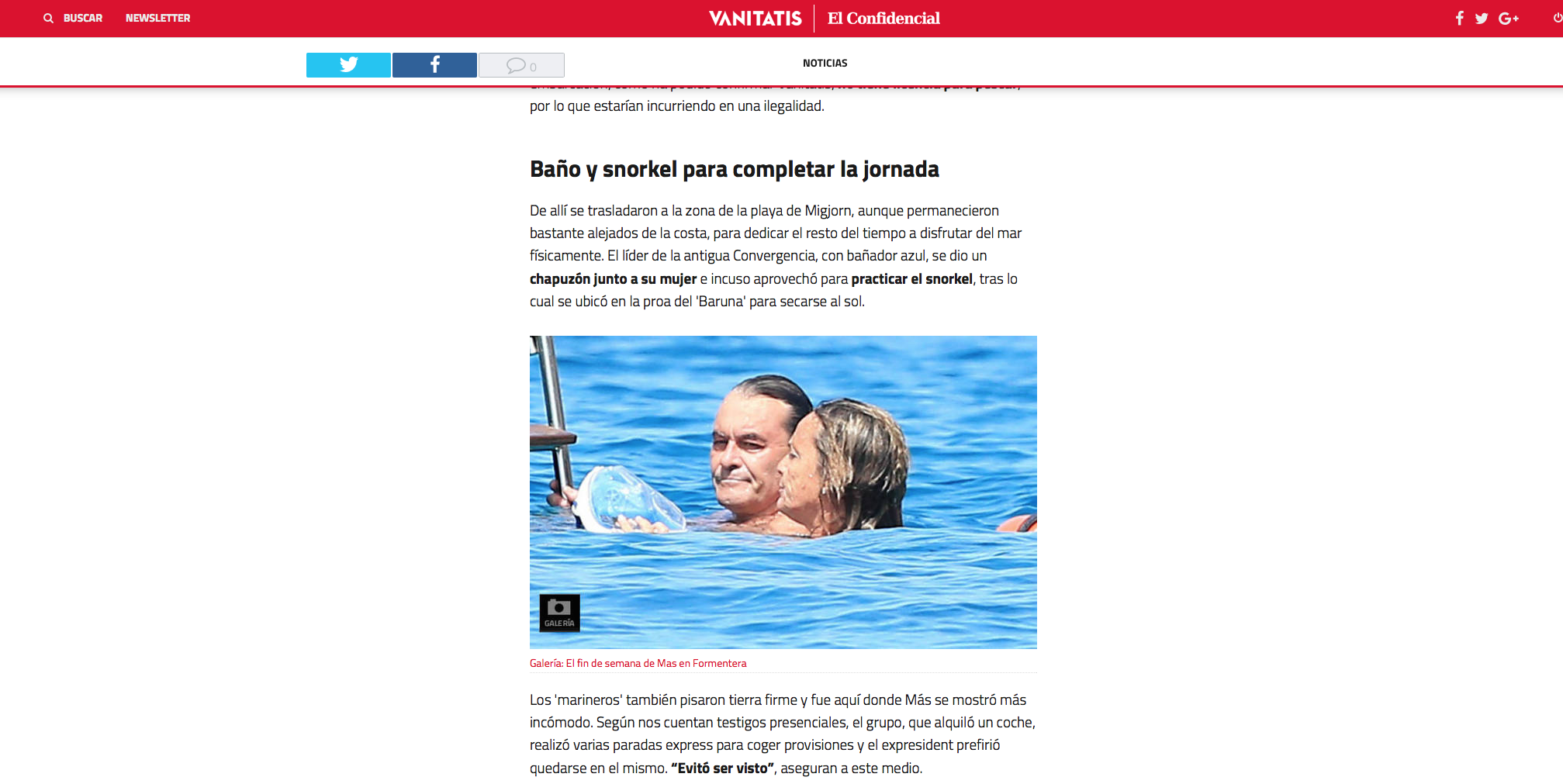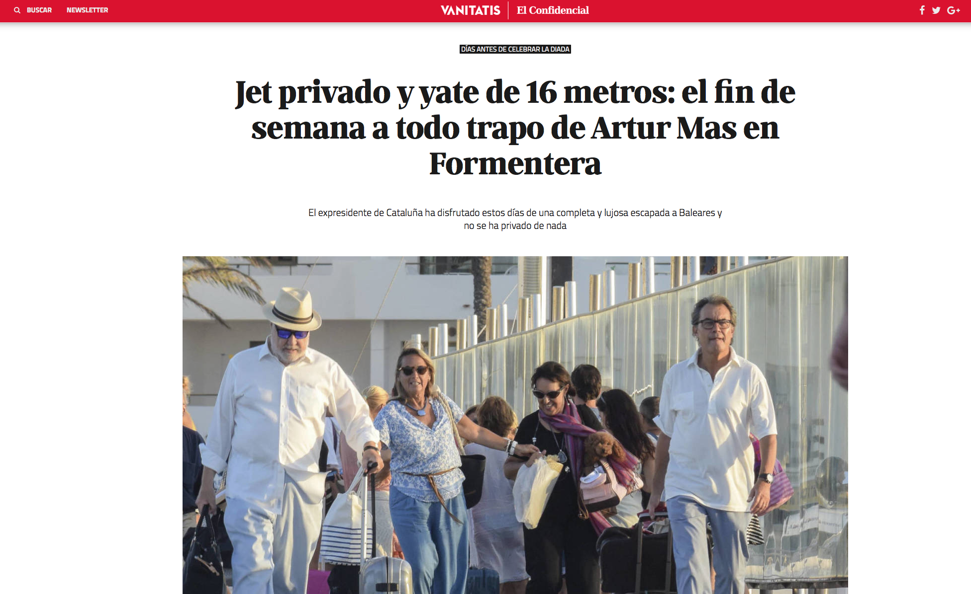 @Noudiari/ El portal de noticias Vanitatis relata el lujoso fin de semana del expresident de la Generalitat, Artur Mas, en Formentera acompañado de su mujer y otro matrimonio. Según relatan en Vanitatis, el expresidente, junto a sus acompañantes, llegó hasta Eivissa, procedente de Barcelona, en un jet privado para luego dirigirse a Formentera en ferry.