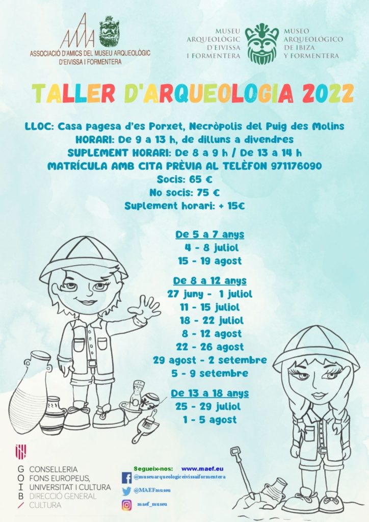 El Museu Arqueològic d’Eivissa i Formentera (MAEF) ha informat aquests dies sobre el Taller d’arqueologia Infantil i Juvenil que realitzarà el centre museístic durant aquest estiu. Per a poder participar-hi, cal demanar cita per fer la inscripció al telèfon 971 176 090.