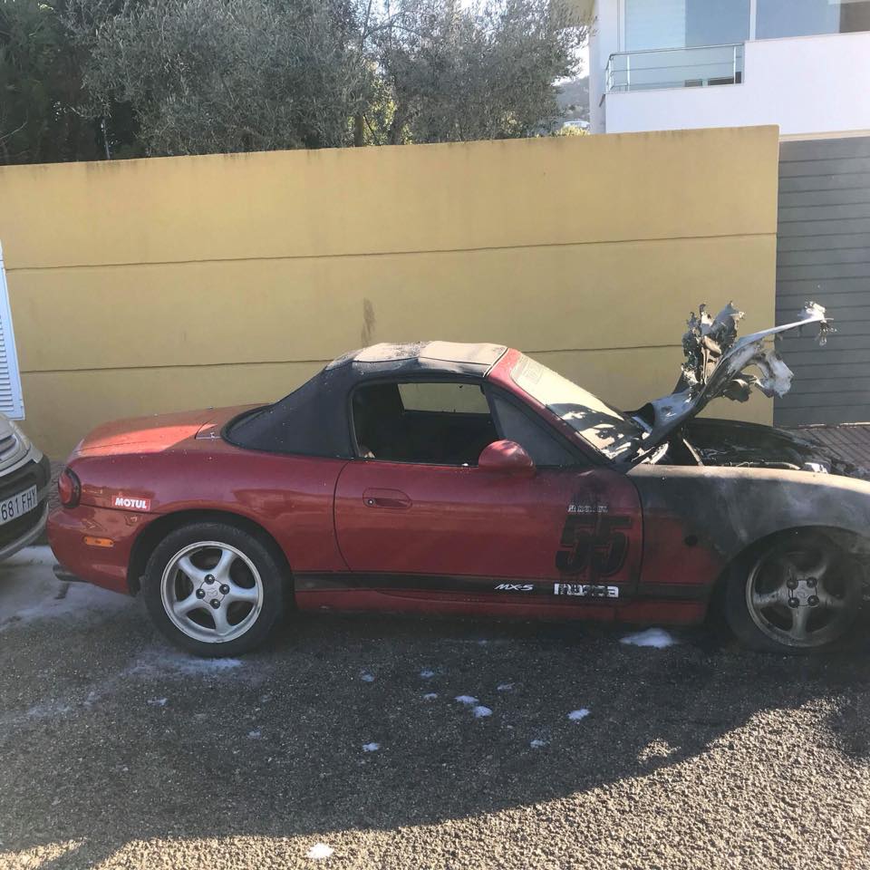 @Noudiari / Los propietarios de este Mazda MX-5 se han llevado un enorme disgusto al despertar esta mañana con su coche envuelto en llamas que rápidamente fueron sofocadas por los bomberos.