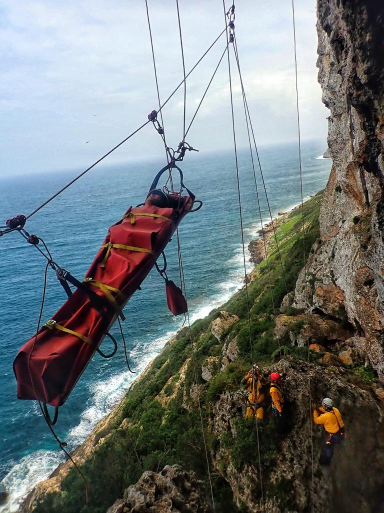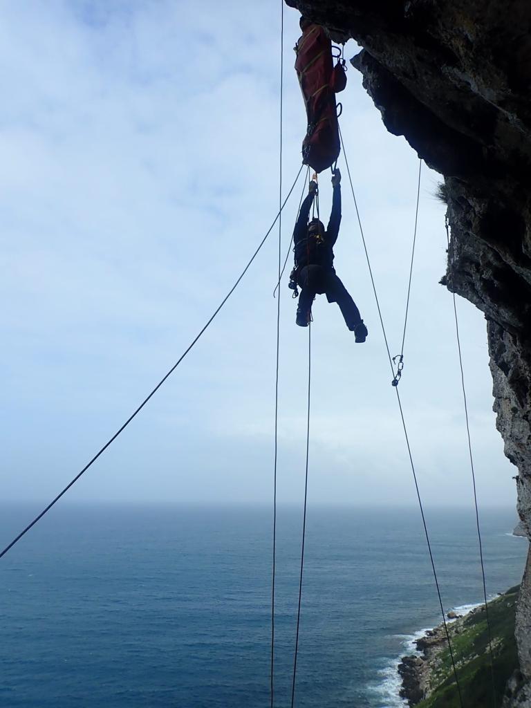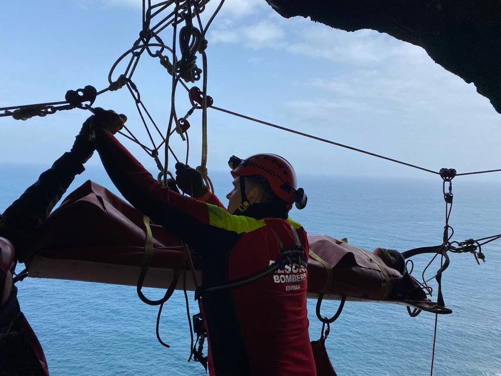 Formentera acogió este domingo dispositivo de evacuación de una persona herida en la cova des Fum de la Mola. Un ejercicio de simulacro bastante espectacular ya que el rescate se hizo con litera mediante la técnica del rapel para superar un desnivel de 60 metros.