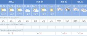 / Iniciamos la semana con un clima parecido al que hemos disfrutado el fin de semana. Sol acompañado de nubes altas, brisas, temperaturas máximas de entre 20 y 25 grados y mínimas de alrededor de 15. Lo que nos proporciona días cálidos para esta época del año.