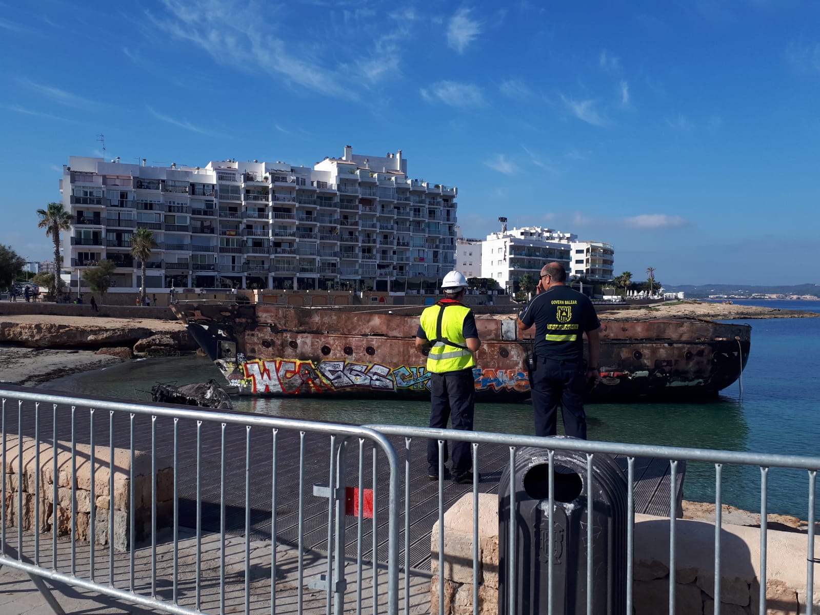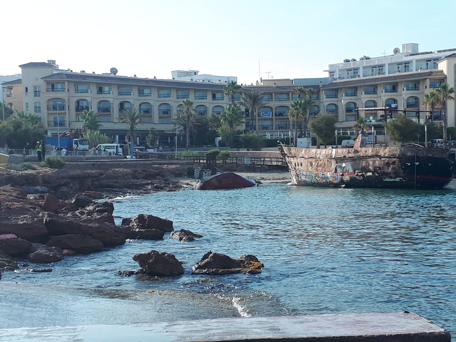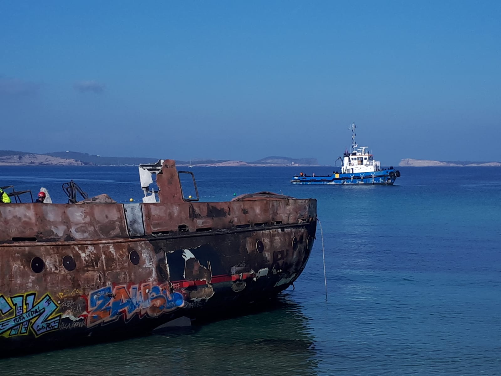 El alcalde de Sant Antoni, Pep Tur ‘Cires’, ha apuntado que el remolcador retirará en primera instancia el ‘Harmonya’, el mayor de los dos buques siniestrados, que será llevado a Castellón para su desguace. Después, le tocará el turno al más pequeño, del que se encargará un desguace local al tratarse «únicamente de residuos».