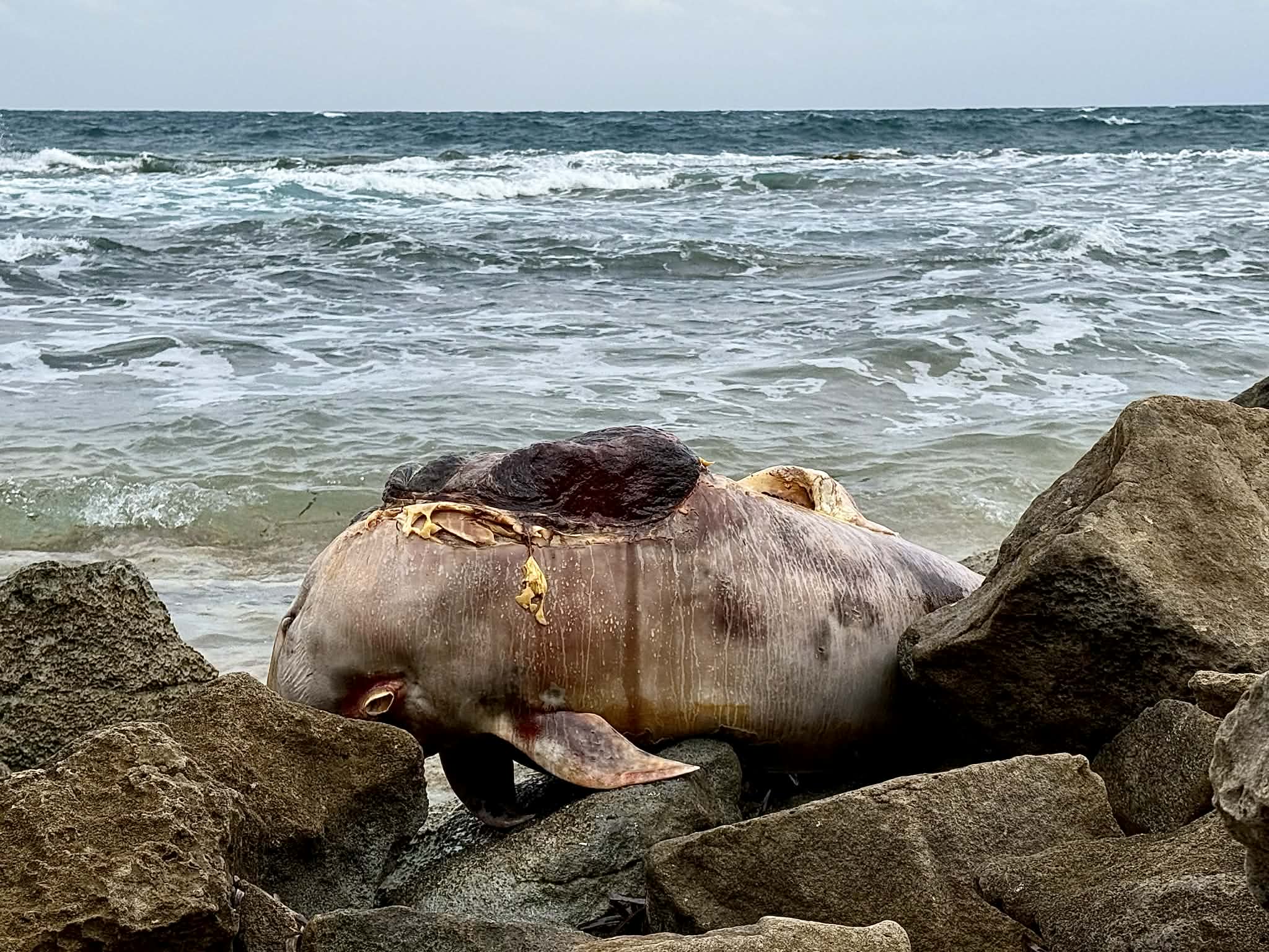 El delfín presenta un estado muy deteriorado y, según se aprecia en la imagen, le falta la aleta dorsal y parte del cuerpo. Además, se observa un bulto de grandes dimensiones en la espalda, lo que podría indicar que el animal sufrió un fuerte impacto antes de morir, aunque este extremo no ha sido confirmado oficialmente.