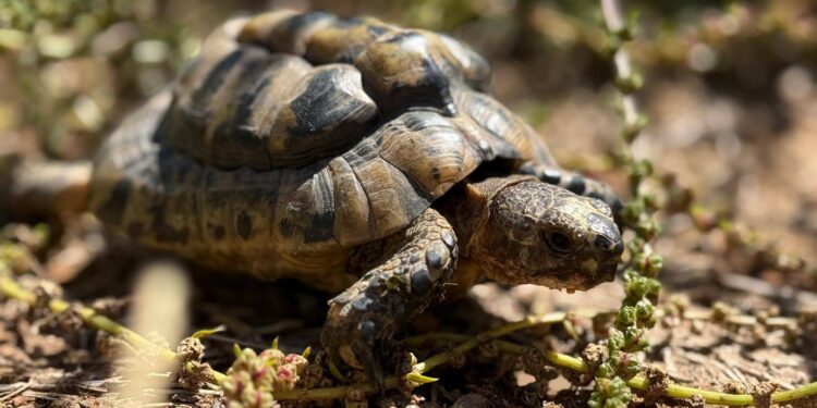 Una vecina de Ses Feixes, la veterinaria Carmen Garzón, ha encontrado esta mañana una tortuga mediterránea en la zona, una especie terrestre protegida y en peligro de extinción. El ejemplar se hallaba en tierra firme.