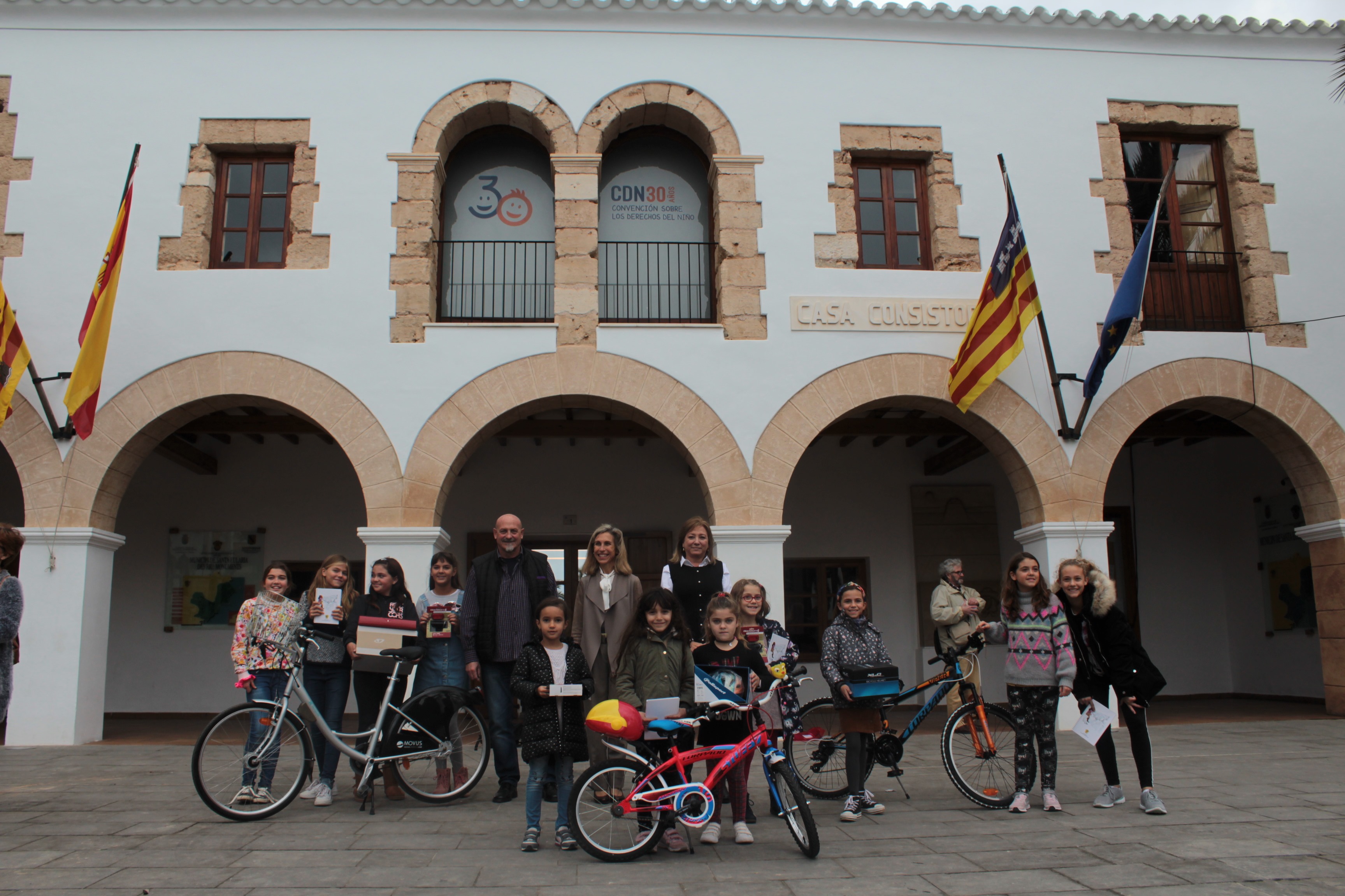 Carmen Ferrer, alcaldessa de Santa Eulària des Riu; Antònia Picó, regidora de Participació Ciutadana; juntament amb José López, tècnic de mobilitat, han sigut els encarregats de lliurar els guardons: un kit de llums per a bicicletes per als tercers, un casc i material escolar per als segons i una bicicleta per als tercers.