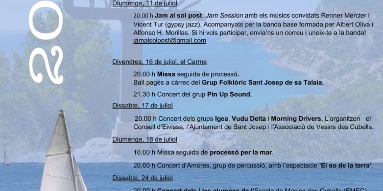 Para el día grande, el viernes 16, habrá misa seguida de procesión y posterior baile payés a cargo del Grupo Folclórico de Sant Josep de sa Talaia, y finalizará con la actuación musical del grupo Pin Up Sound. El domingo, 18 de julio, se realizará la procesión marinera saliendo de es Cubells en la tradicional ofrenda a las víctimas del mar.