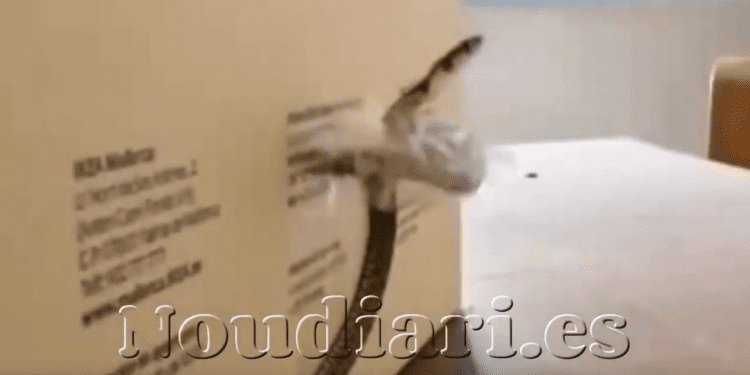 Esto es lo que le ha pasado a una familia que reside en una casa de campo en Sant Miquel, que envía a Noudiari este vídeo en el que muestran cómo una culebra se ha quedado pegada al celo de una caja de cartón de un envío que acababan de recibir.