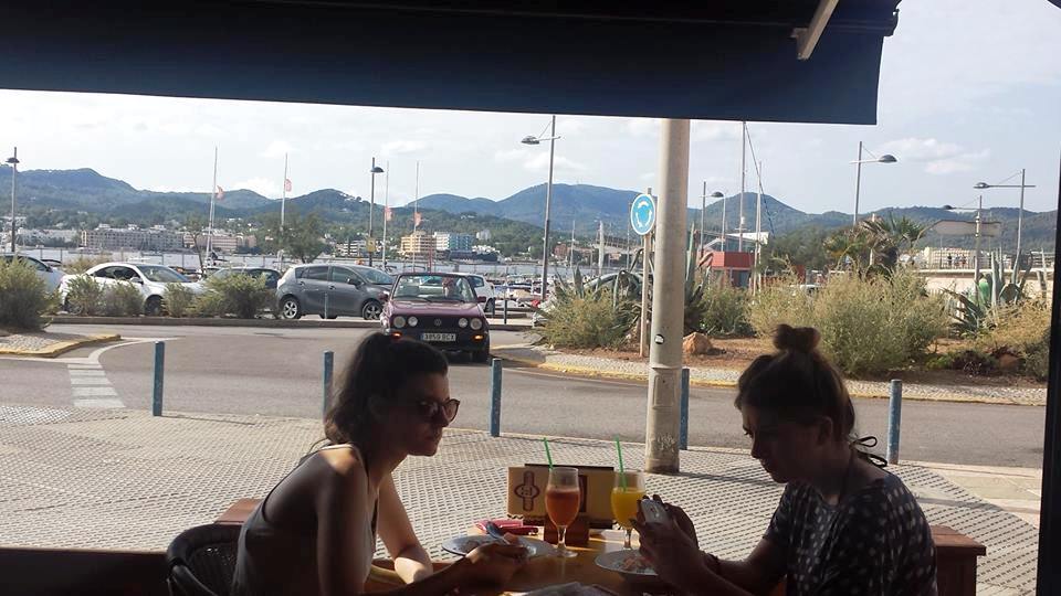 Dos turistas toman el desayuno tranquilamente mientras que un coche ha estacionado en la rotonda.