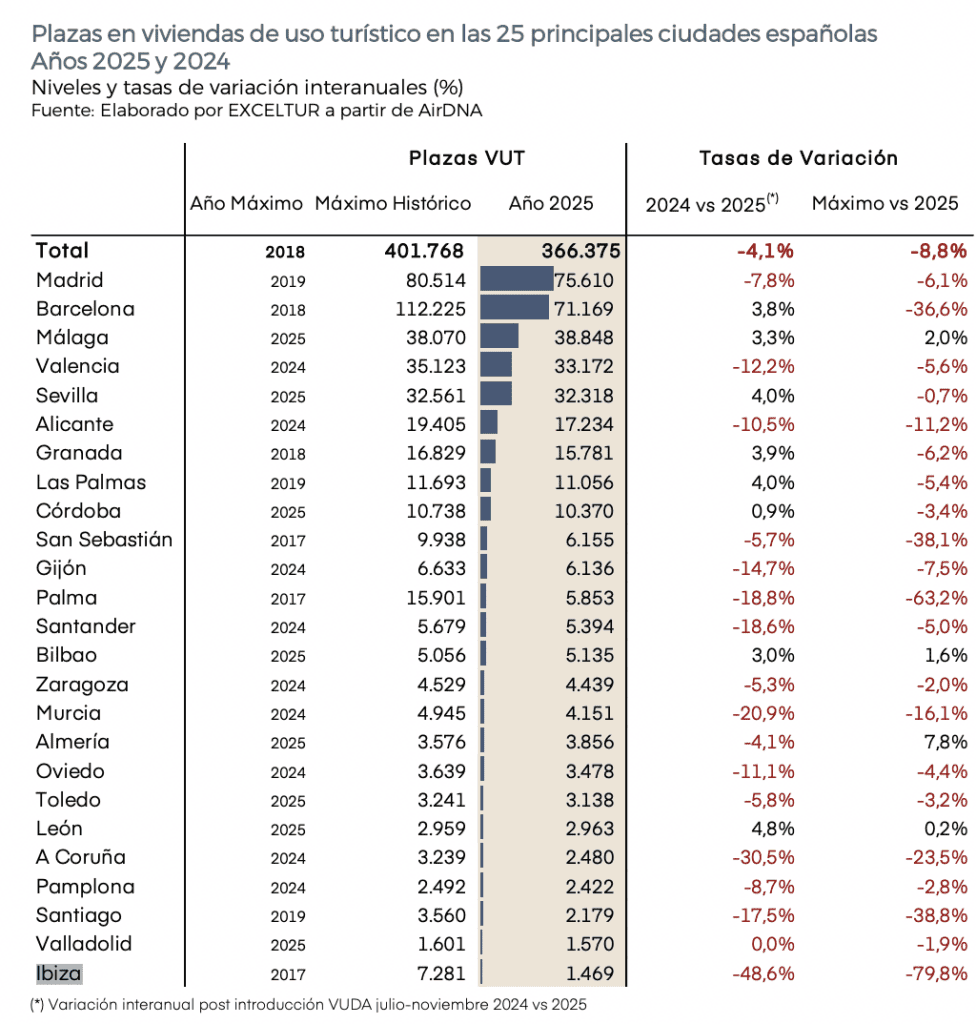 Así, por primera vez, el número de viviendas de uso turístico en las 25 principales ciudades españolas se redujo (un 4,1 % la media julio-noviembre frente a ese periodo de 2024), lo que supone 15.963 plazas menos y un total de 366.000 al terminar el año.