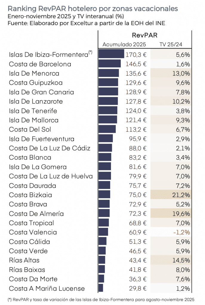 En esta clave y dentro de una dinámica positiva en casi todas las zonas de costa, se sitúan los resultados de 2025 de Menorca (+13,0% vs 2024, 135,6€ de ingreso medio en 2025), Lanzarote (+10,2%, 127,8€), Gran Canaria (+7,8%, 128,9€), Mallorca (+9,3%, 121,4€) e Ibiza y Formentera (+5,6%, que con 170,3€ vuelve a liderar los niveles de ingresos en España).