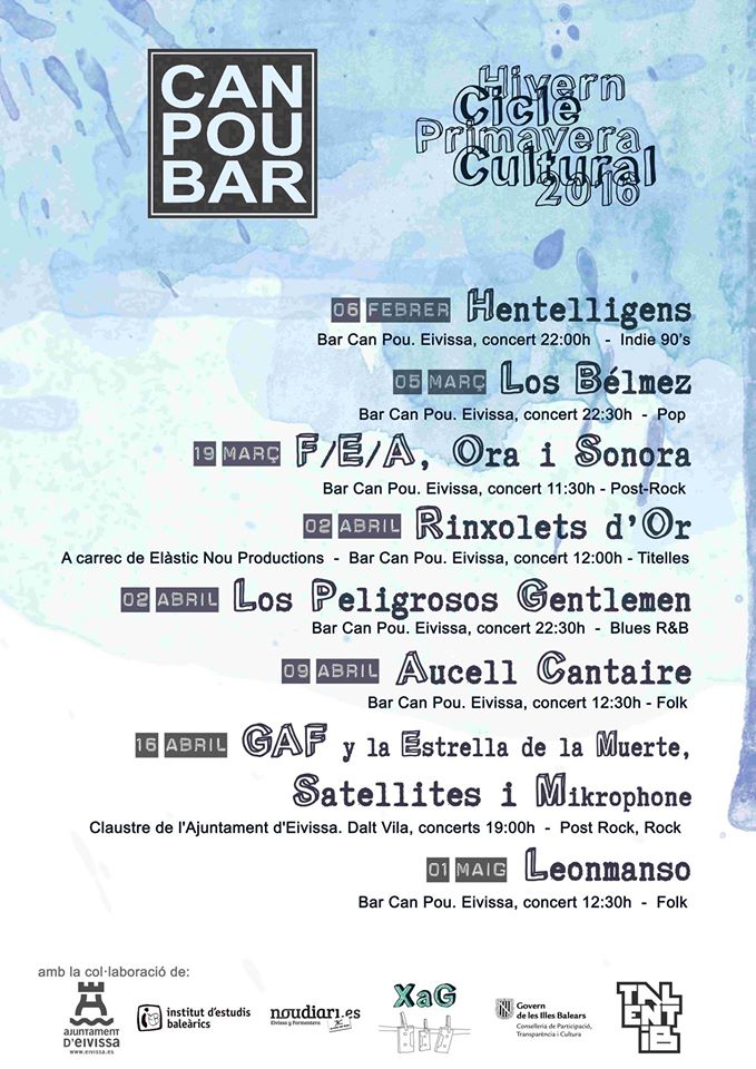 Entretanto, Can Pou despedirá el invierno y recibirá la primavera con actuaciones de la banda de blues ‘Los peligrosos gentlemen’ o el rock de ‘Satellites’, además de otros grupos de música indie, folk, blues, folk… Las actuaciones tendrán lugar en diferentes fechas y enclaves, aunque gran parte de ellas se desarrollarán en el bar Can Pou.