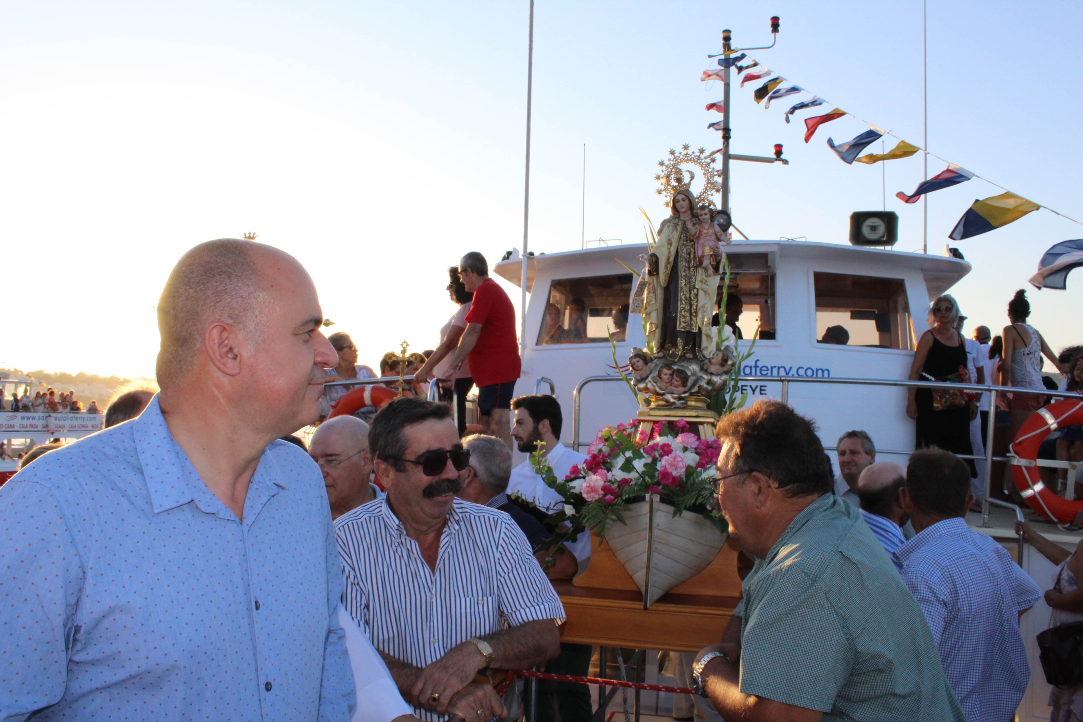Posteriormente se ha vuelto a puerto, la imagen ha sido devuelta a la capilla mientras que en las instalaciones del Club Náutico se ha ofrecido un piscolabis. El alcalde de Santa Eulària, Vicent Marí; y la regidora de Cultura y de la Parroquia de Santa Eulària, Ana Costa, han participado en la comitiva que ha contado también con la colaboración del Coro Rociero de Santa Eulària y de los sonadors de la Pandilla es Broll.