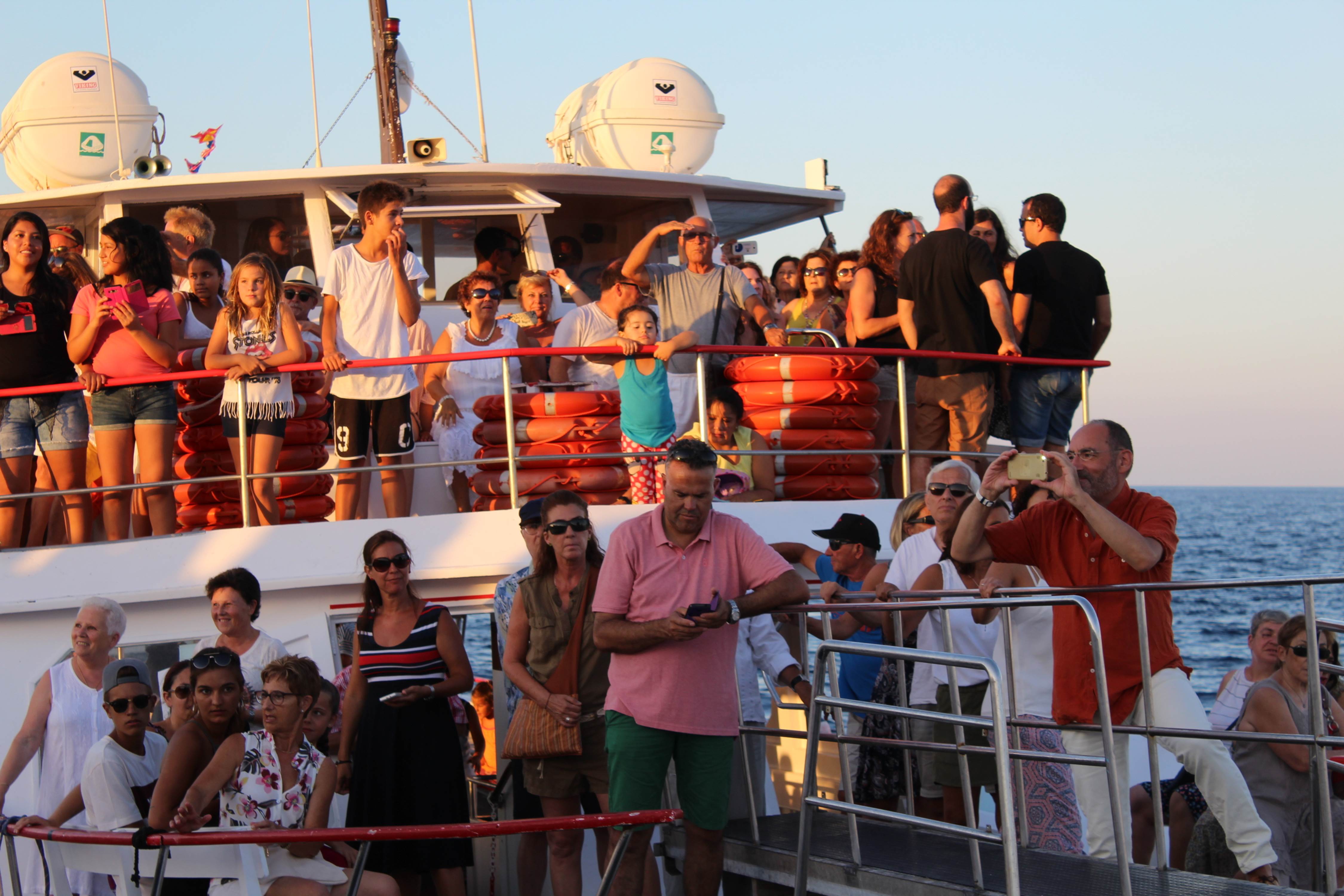 Una vez allí, la imagen ha sido embarcada en el ‘Super Popeye’, una de las cinco embarcaciones que Santa Eulalia Ferry ha puesto a disposición del ‘Club Náutico Santa Eulària’, organizador de la procesión. La comitiva, formada por cerca de medio millar de personas y que ha sido acompañada por otras 25 embarcaciones de menor tamaño, ha ido más de una milla mar adentro para hacer la ofrenda floral en honor de las personas que han perdido la vida en sus aguas.