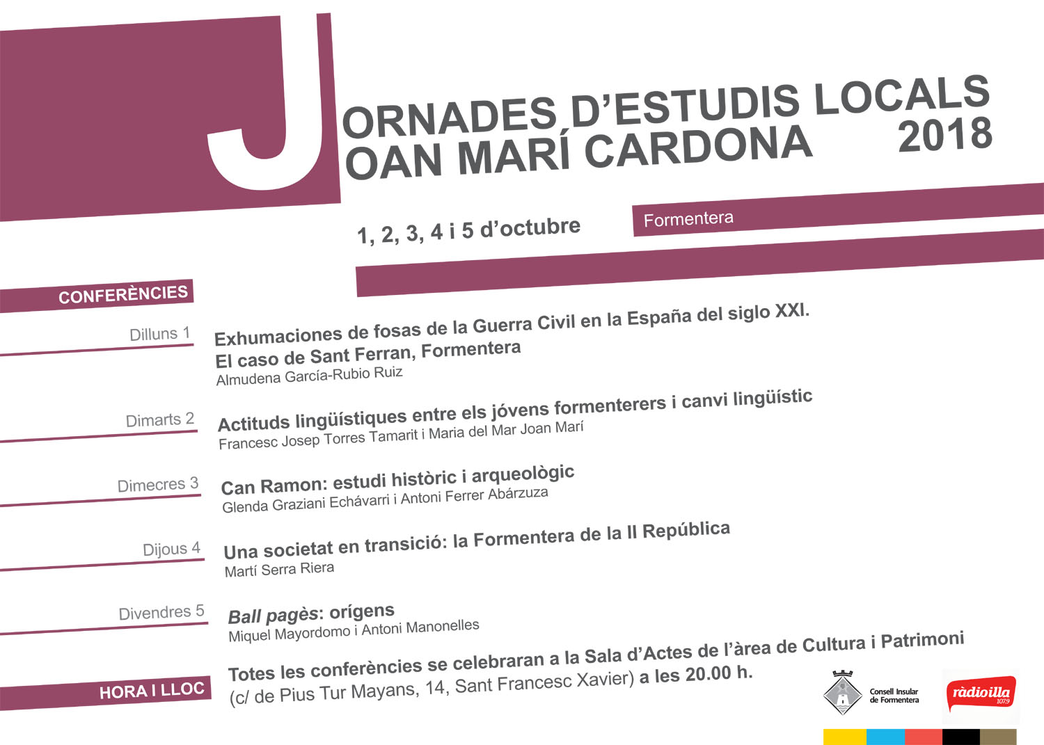 @Noudiari / El Consell de Formentera, a través de l’àrea de Patrimoni, informa que la propera setmana, entre el dilluns 1 i el divendres 5 d’octubre, tindrà lloc la VIII edició de les Jornades d’Estudis Locals Joan Marí Cardona. Totes les conferències es faran a la Sala d’Actes de l’àrea de Cultura i Patrimoni, a partir de les 20h.