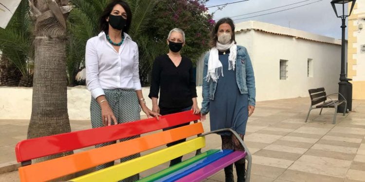 La presidenta Alejandra Ferrer, la vicepresidenta Ana Juan y la consejera de Igualdad y LGTBIQ+, Vanessa Parellada, han acudido a la plaza de la Constitución de Sant Francesc para mostrar un banco que desde hoy luce los colores de la bandera del colectivo como símbolo de apoyo a este colectivo.