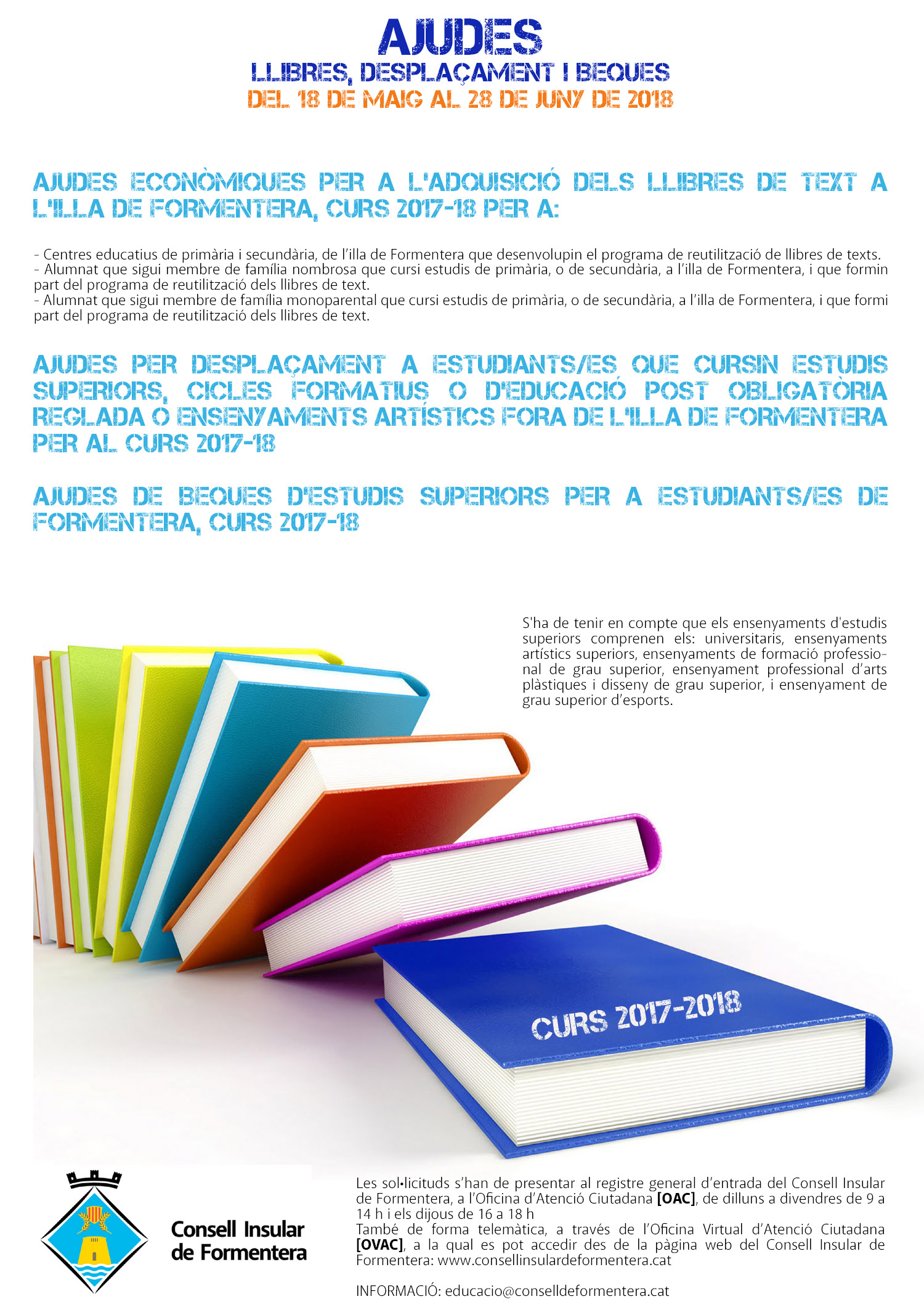 @Noudiari / El Consell de Formentera, a través de l’àrea d’Educació, informa que des d’avui i fins el proper 28 de juny restà obert el termini per demanar ajudes per l’adquisició de llibres de text de reutilització, beques d’estudis superiors i ajudes per desplaçament a estudiants per al curs 2017-2018.