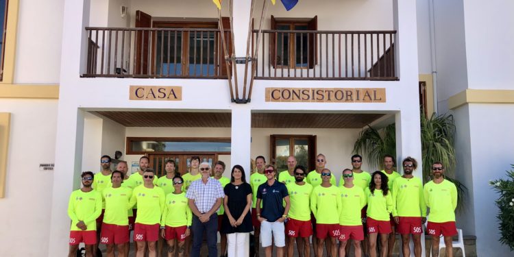La presidenta del Consell de Formentera, Ana Juan, i el conseller d’Interior, Josep Marí, s’han fet una foto de grup, avui al matí a la plaça de la Constitució, amb els membres de la plantilla del servei de socorrisme del Consell de Formentera d’aquest 2022. La presidenta i el conseller els han desitjat “molta sort per a aquesta temporada”.