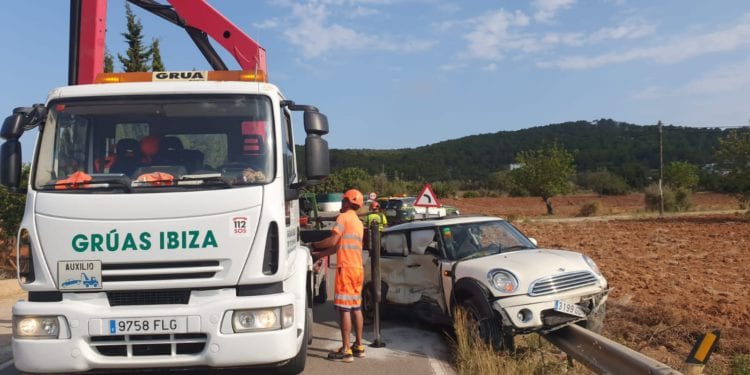 Un Citroën C4 de alquiler ha embestido lateralmente a un Mini en la vía que une las carreteras de Sant Joan y Santa Eulària en un accidente de tráfico ocurrido esta tarde en Ibiza. Los ocupantes de ambos vehículos han sufrido heridas de diversa consideración y han tenido que ser trasladados en ambulancia al hospital. Como consecuencia del fuerte impacto, el Mini, como se aprecia en la imagen que acompaña estas líneas, ha ido a parar encima del guardarrail. Al lugar del siniestro se han desplazado Guardia Civil, efectivos de la Xarxa Viaria y dos equipos de auxilio en carretera de Grúas Ibiza, uno de ellos grúa pluma para bajar el coche de la valla. El tráfico se ha reanudado con normalidad una hora después.