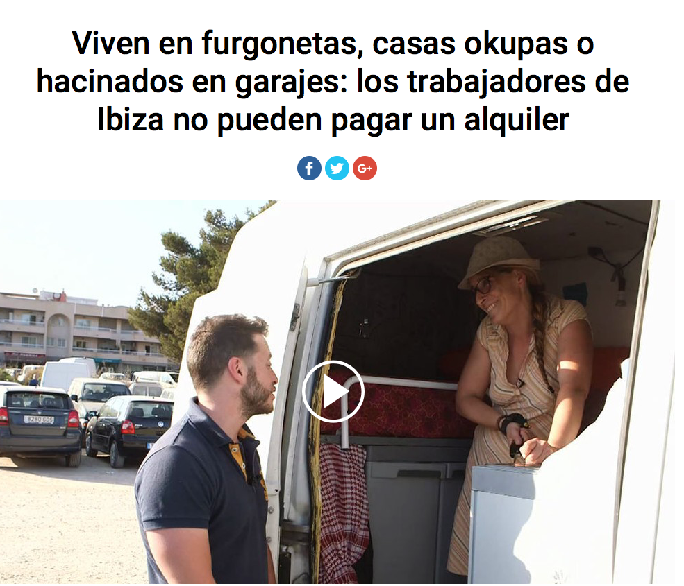 «Una sola habitación puede llegar a costar 900 euros, por lo que, con un sueldo medio de 1.300 es inviable adquirir un lugar donde dormir. Muchos currantes se ven obligados a vivir en caravanas, furgonetas o casas okupas durante todo el año», explica el reportaje, que enseña la situación de una empleada de un hotel de Ibiza que vive en un furgoneta porque su sueldo de 1.400 euros al mes «no le permite adquirir una vivienda digna, dado los precios desorbitados de los alquileres y la compraventa de la isla». «Vive todo el año dentro de este vehículo, donde ha habilitado una cama, una cocina y una ducha solar para ella sola», explica en ‘En el punto de mira’.
