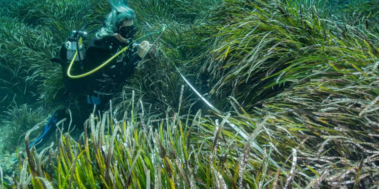 Técnicos del Área Marina del GEN-GOB se han sumergido de nuevo en las aguas de Cala Vedella esta semana para empezar a estudiar la evolución de su pradera de Posidonia oceanica.