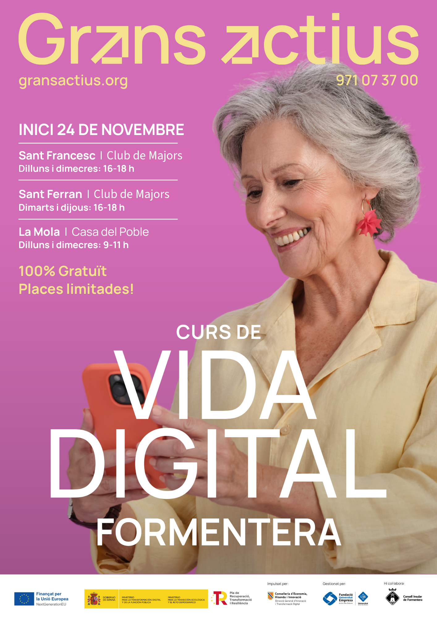 A partir del 24 de noviembre, Formentera acogerá el programa ‘Grans Actius’ con el Curso de Vida Digital, una iniciativa formativa totalmente gratuita dirigida a personas mayores de 55 años para reducir la brecha digital y fomentar su participación en el mundo digital.