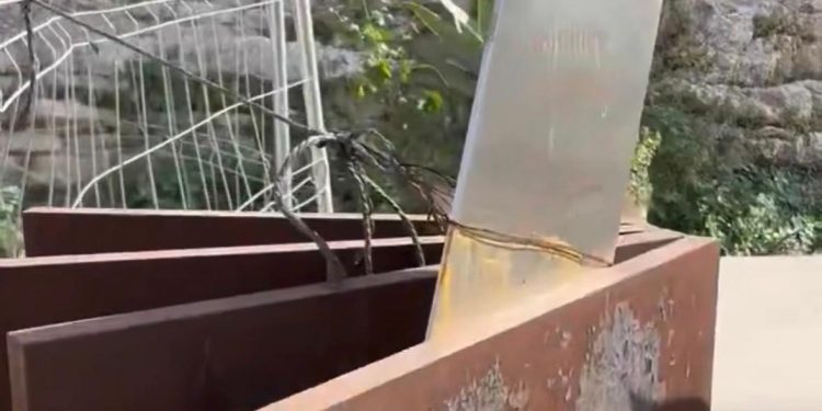El estado de conservación del monolito dedicado a las Homilies d’Organyà en Ibiza, situado bajo las murallas renacentistas y junto a la plaza del Parque, ha quedado seriamente cuestionado. Un vídeo evidencia que desde hace tiempo se utiliza como punto de anclaje y soporte improvisado de una valla de obra municipal, mediante cables metálicos y otros elementos que están dañando directamente el monumento. En las imágenes se aprecia cómo el cable ha oxidado la superficie de la placa y cómo el conjunto de la escultura, obra de Ramon Maria Jounou, presenta un notable deterioro y suciedad.