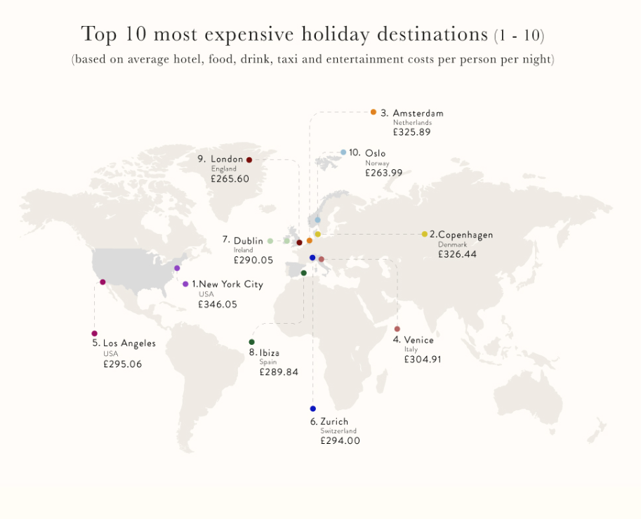 Según explican, el ranking sale tras comparar los precios más caros y más baratos para alojamiento, comidas, bebidas y tarifas de taxi. Así, mientras una noche por persona en Nueva York, con todo incluido, saldría por más de 346 dólares, en Ibiza se pagarían cerca de 290 dólares por noche y persona.