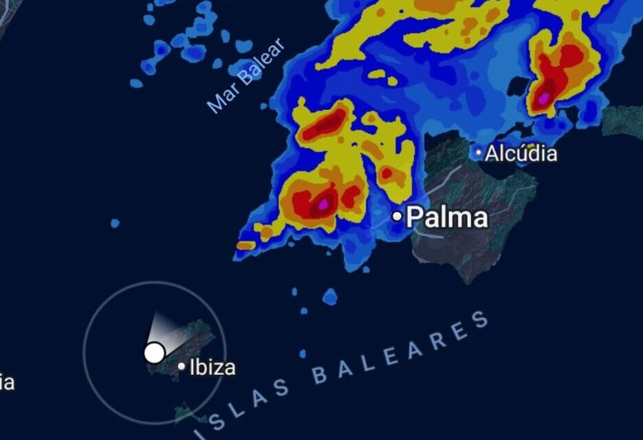 Es suficiente con ver la imagen que acompaña esta noticia, obtenida de la App Alarma de Lluvia, de las 2.45 de la pasada madrugada, justo en el momento en el que la tormenta tocaba tierra en Mallorca, donde en Palma acabaría dejando 42,9 litros por metro cuadrado. En Ibiza, en cambio, apenas dejó caer alguna llovizna.