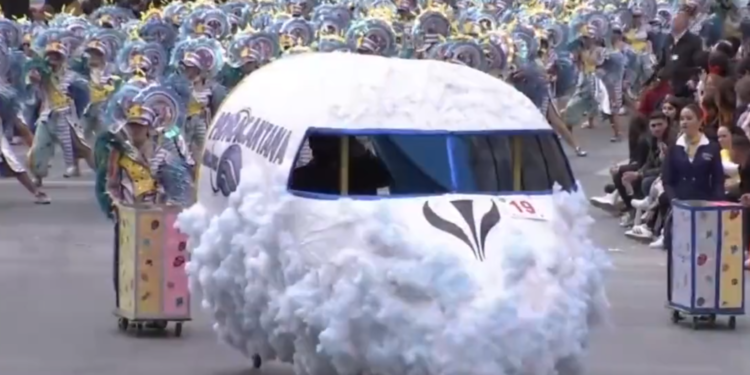 La comparsa esta encabezada por un avión rodeado de nubes, que simboliza el viaje de Badajoz a Ibiza, seguida por los integrantes que han ensayado durante semanas una elaborada coreografía de la mano de Carlota Gómez y sus ‘coreo-queens’ (reinas de la coreografía).