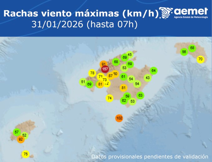 Hasta las 08.24 horas, las estaciones de Aemet han registrado rachas de hasta 92 km/h en el aeropuerto de Ibiza, mientras que en Formentera se han alcanzado los 75 km/h, valores que sitúan a ambas islas entre las zonas con viento más fuerte del archipiélago.