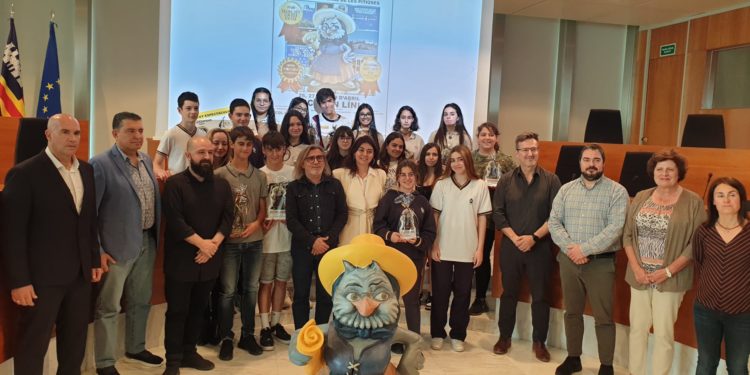 En acabar l’acte de lliurament dels premis, la consellera del Departament de Cultura, Educació i Patrimoni, Sara Ramón Roselló i el director insular de Cultura, Miquel Costa, fan entrega de l’Olibassa al col·legi de La Consolació, centre guanyador.