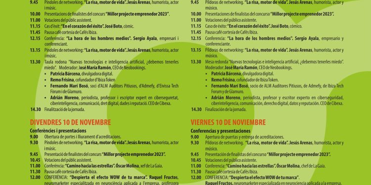 Además, se podrá pronunciarán las conferencias ‘Camino hacia las estrellas’, a cargo del chef Óscar Molina, y ‘Despierta el efecto WOW de tu marca’, a cargo de la neuromarketer especializada en aplicación de neurociencia a la empresa Raquel Fructos, y el CEO de Frutos Secos Ibiza, Saúl Madrid, presentará el caso de éxito ‘Cómo conseguir que tu empresa esté 45 años de boca en boca’.