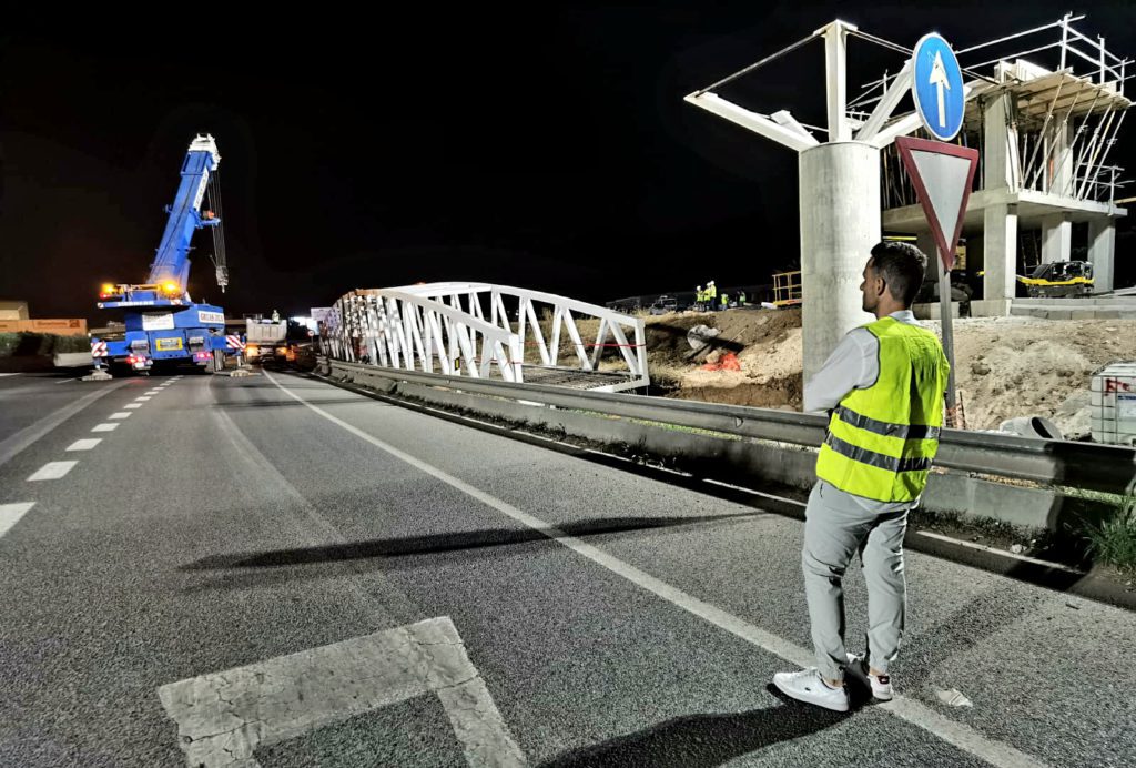 Dos momentos de la instalación de la pasarela, esta madrugada, con la presencia del conseller de Infraestructuras. Imagen: Mariano Juan / Consell d’Eivissa
