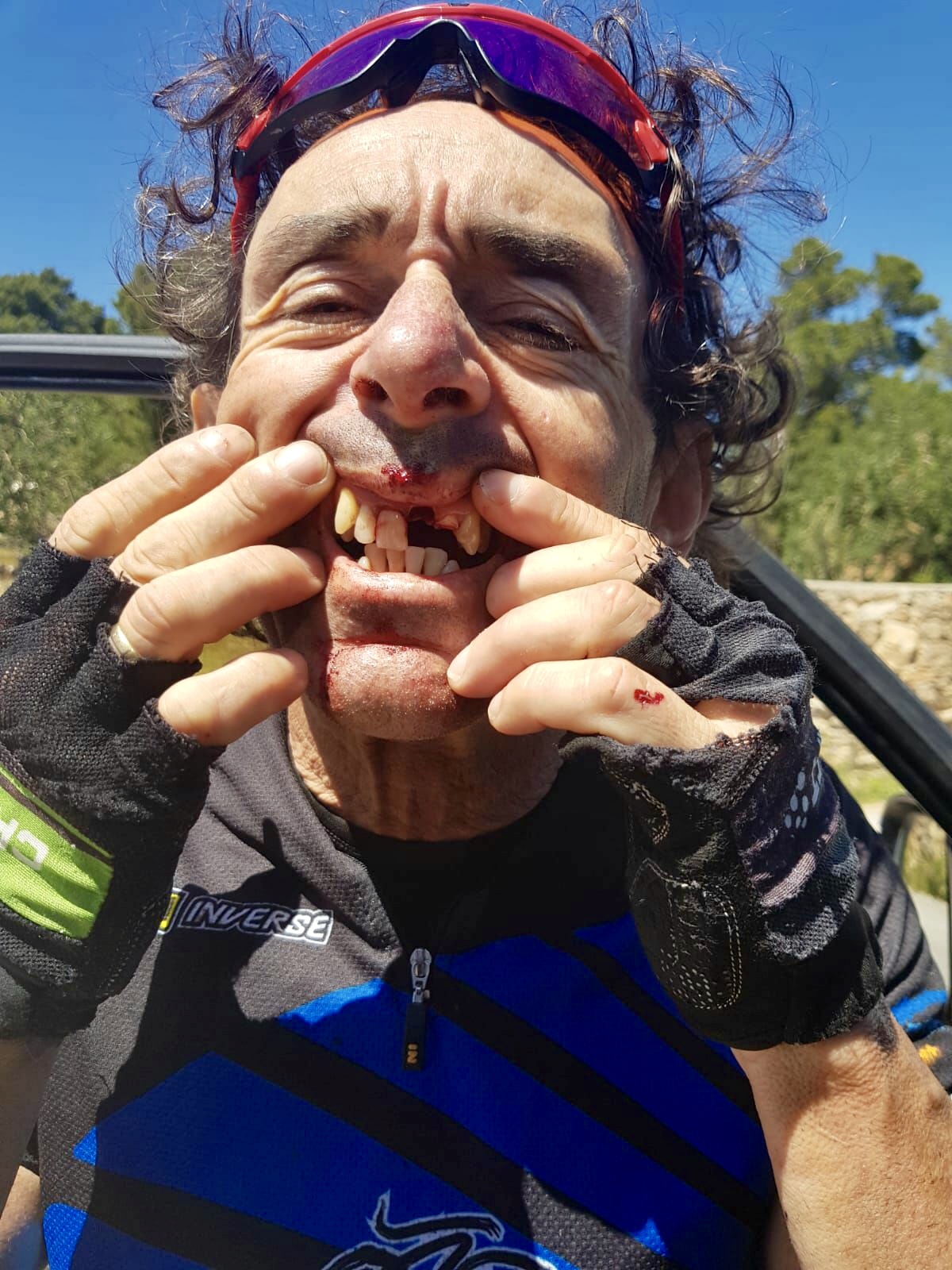 ‘Rambo’ Viñals descendía por la carretera con su bicicleta de montaña y no pudo evitar la colisión contra un vehículo de alquiler, que se cruzó en su trayectoria al intentar acceder a un camino de tierra. Viñals golpeó con la cabeza contra la luna delantera y perdió tres piezas dentales.