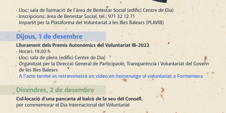 El Consell de Formentera, a través de l’àrea de Benestar Social, informa de les activitats que se celebren a Formentera durant una setmana amb motiu del Dia International del Voluntariat, que es commemora el 5 de desembre. El conseller de Benestar Social, Rafel Ramírez, ha destacat la tasca “que porten a terme les entitats i les persones voluntàries de Formentera amb l’objectiu d’aconseguir una societat més igualitària, participativa i associativa” i ha assenyalat que “les institucions hem de contribuir en el seu suport, reconeixement  i visibilització a la societat”.