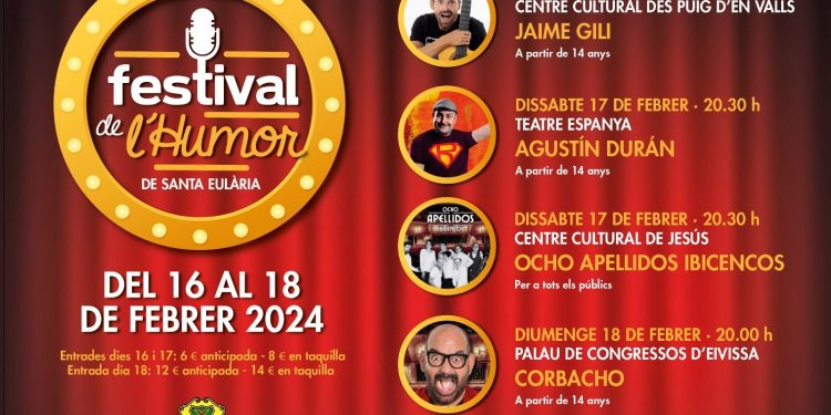 El Festival de l’Humor que organiza el Ayuntamiento de Santa Eulària des Riu para las fiestas de Santa Eulària llega este 2024 a su tercera edición con un cartel muy atractivo en el que destaca la actuación de clausura con el humorista, presentador de televisión y director de cine José Corbacho. Igualmente, también cabe señalar la vuelta a los escenarios del montaje ‘Ocho apellidos ibicencos’ el cual cosechó un gran éxito hace años en su estreno. Completan la programación, que tendrá lugar entre el 16 y el 18 de febrero, el humorista manchego Agustín Durán y el mallorquín Jaime Gili. Los tiques para asistir a alguna de las representaciones estarán disponibles en el apartado ‘Venta de entradas’ de la web www.santaeulariadesriu.com.