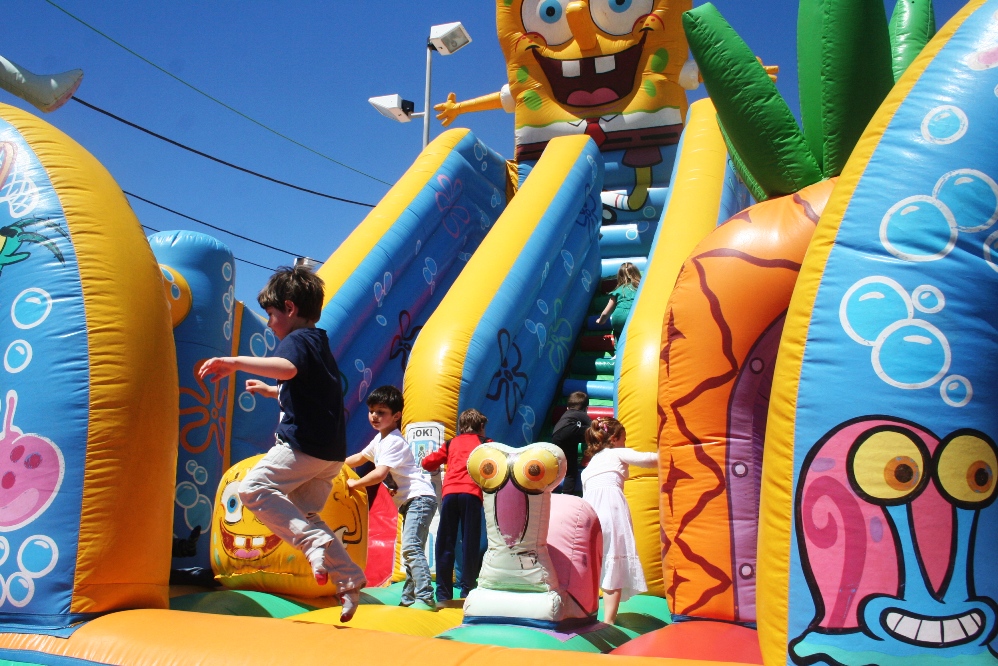 Los menores, mientras tanto, también podían jugar en las diferentes atracciones instaladas en la plaza de la iglesia, mientras que los adultos ojeaban los puestos de libros o, si no estaban en la misa y degustando el vino y las orelletes posteriores, paseaban por el mercadillo de Sant Jordi, también repleto de gente.