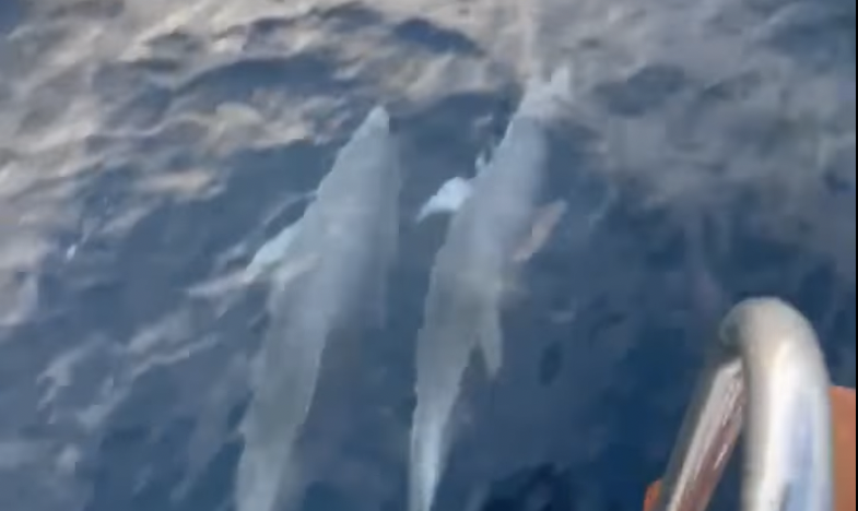 Una captura del vídeo de Juan Carlos Escandell cedido a Noudiari.es que muestra a dos delfines en la proa de un llaüt de nueva construcción. Cerca había más ejemplares. Imagen Juan Carlos Escandell