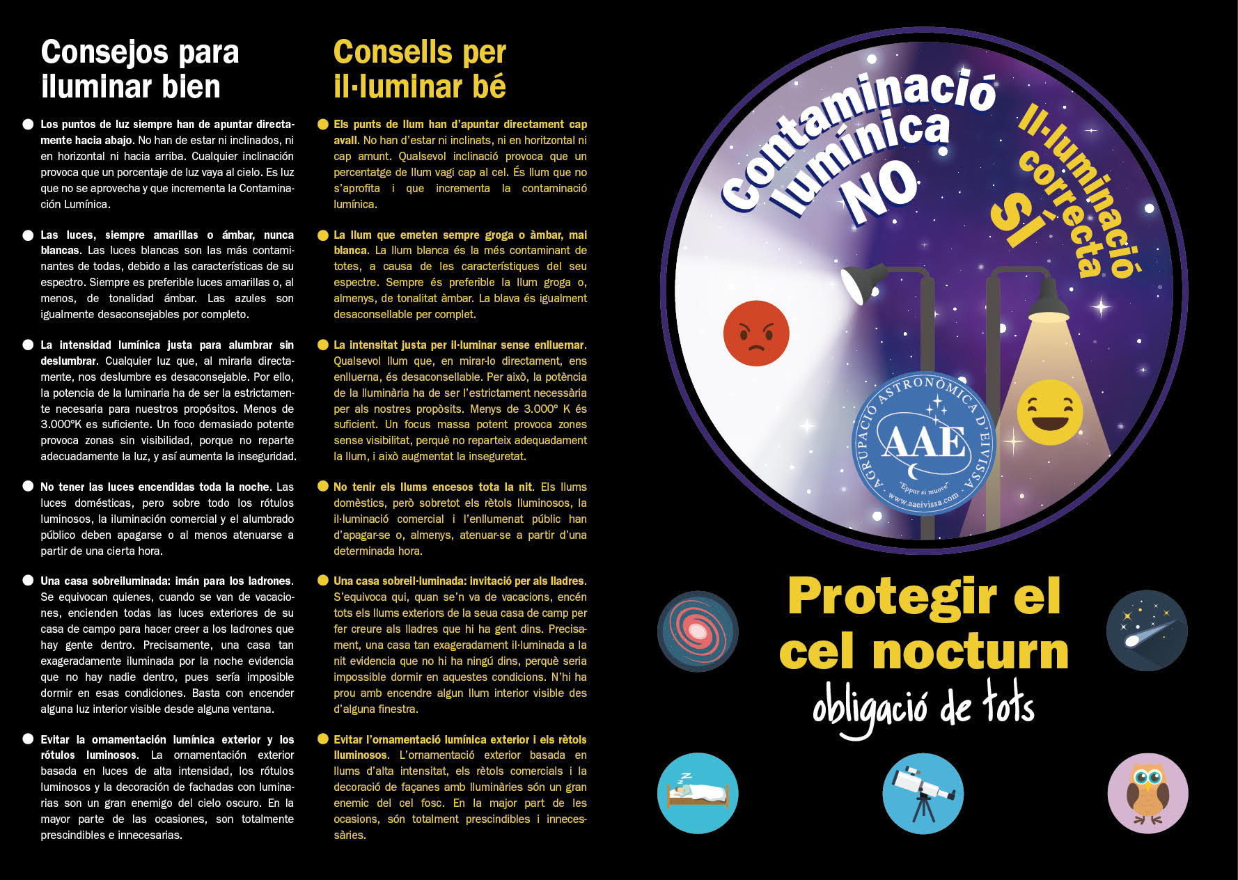 La campaña consiste en la distribución de centenares de dípticos informativos sobre las causas de la contaminación lumínica, los efectos que provoca sobre la actividad astronómica y también las formas de iluminar correctamente. «La luz de color blanco es la peor de todas; hay que utilizarla de tonalidad ámbar o amarilla, que es más respetuosa», insisten.