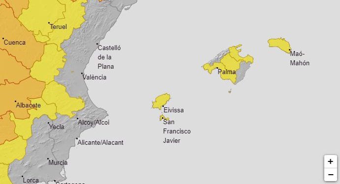 La Agencia Estatal de Meteorología activa la alerta amarilla por las altas temperaturas que afectarán a Ibiza y Formentera este domingo. Los termómetros podrían rozar los 34 grados al oeste de Ibiza y en toda la pitiusa menor, la alerta estará activa entre las 14:00 horas y las 17:59 horas. El cielo poco nuboso contendrá calima con polvo en suspensión.