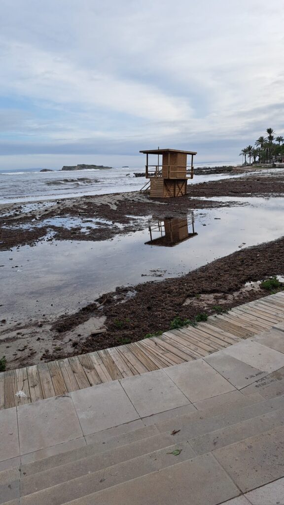 El temporal también ha afectado a la playa de Ses Figueretes, donde el mar comió literalmente la arena dejando la caseta de los socorristas rodeada de agua y de posidonia.