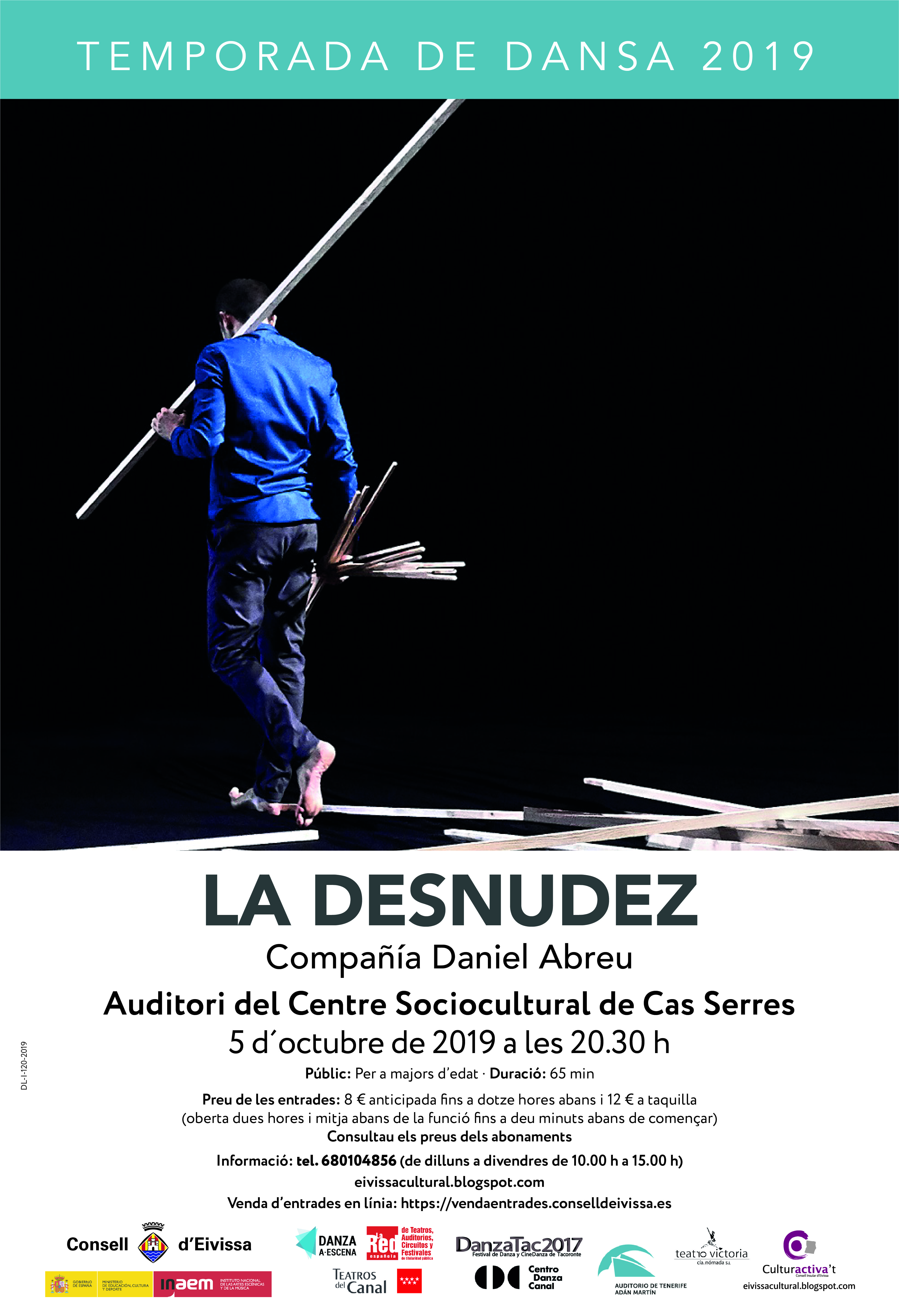 ‘La Desnudez’ es representarà a les 20.30 h, a l’Auditori del Centre Sociocultural de Cas Serres. El preu de les entrades és de 8 € en anticipada, fins dotze hores abans de l’espectacle, i 12 € a taquilla (oberta dues hores i mitja abans de la funció fins deu minuts abans de començar). Venda d’entrades en línia: https://vendaentrades.conselldeivissa.es