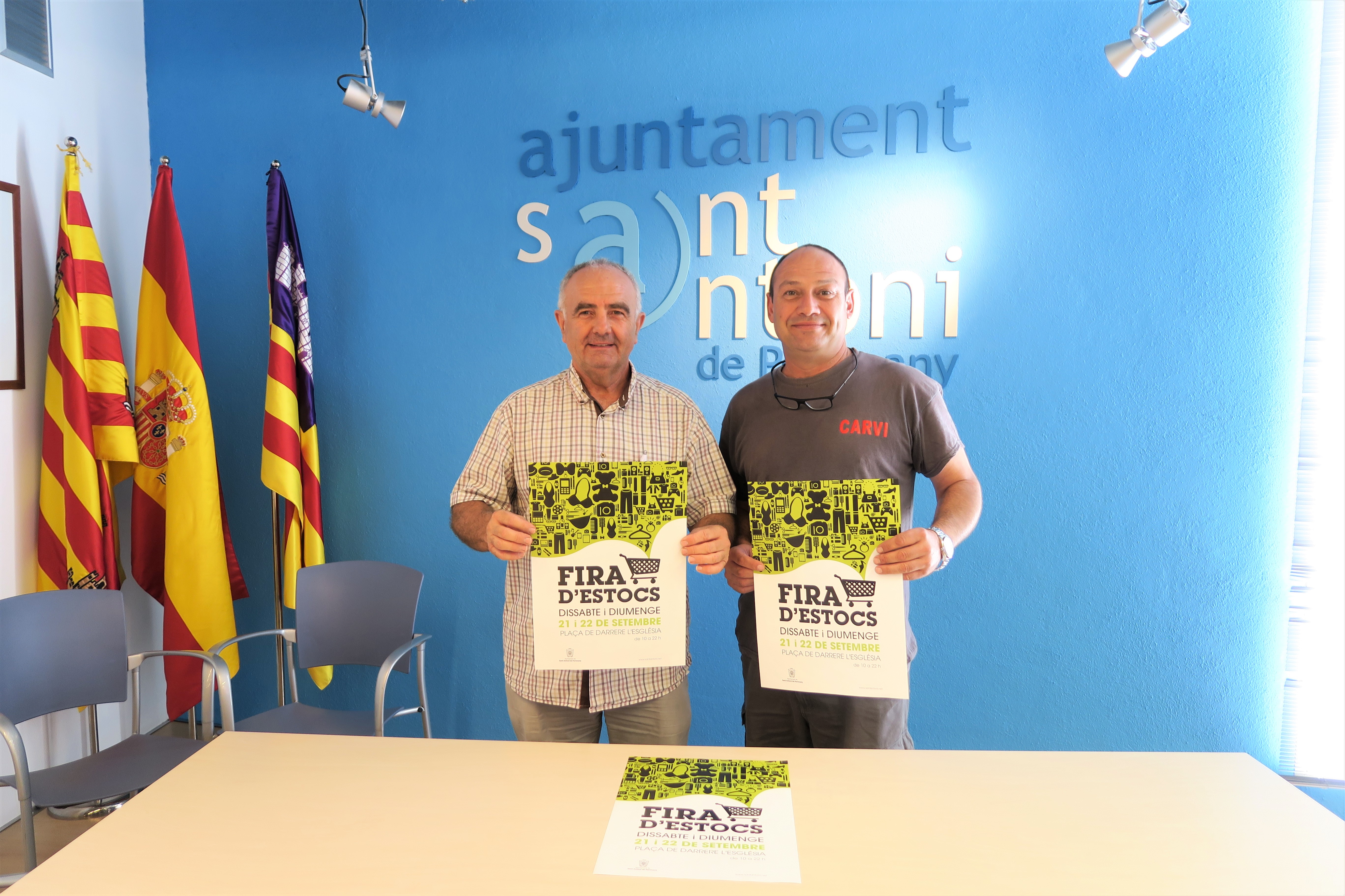 @Noudiari / El concejal de Comercio de Sant Antoni, Joan Torres, y el representante de la Asociación de Comerciantes del municipio, Vicente Cardona, han presidido esta mañana el sorteo para la vigésima edición de la Fira d’Estocs, que se celebra este fin de semana del 21 y 22 de septiembre en la plaza de detrás de la iglesia con un horario de 10.00 a 22.00 horas.