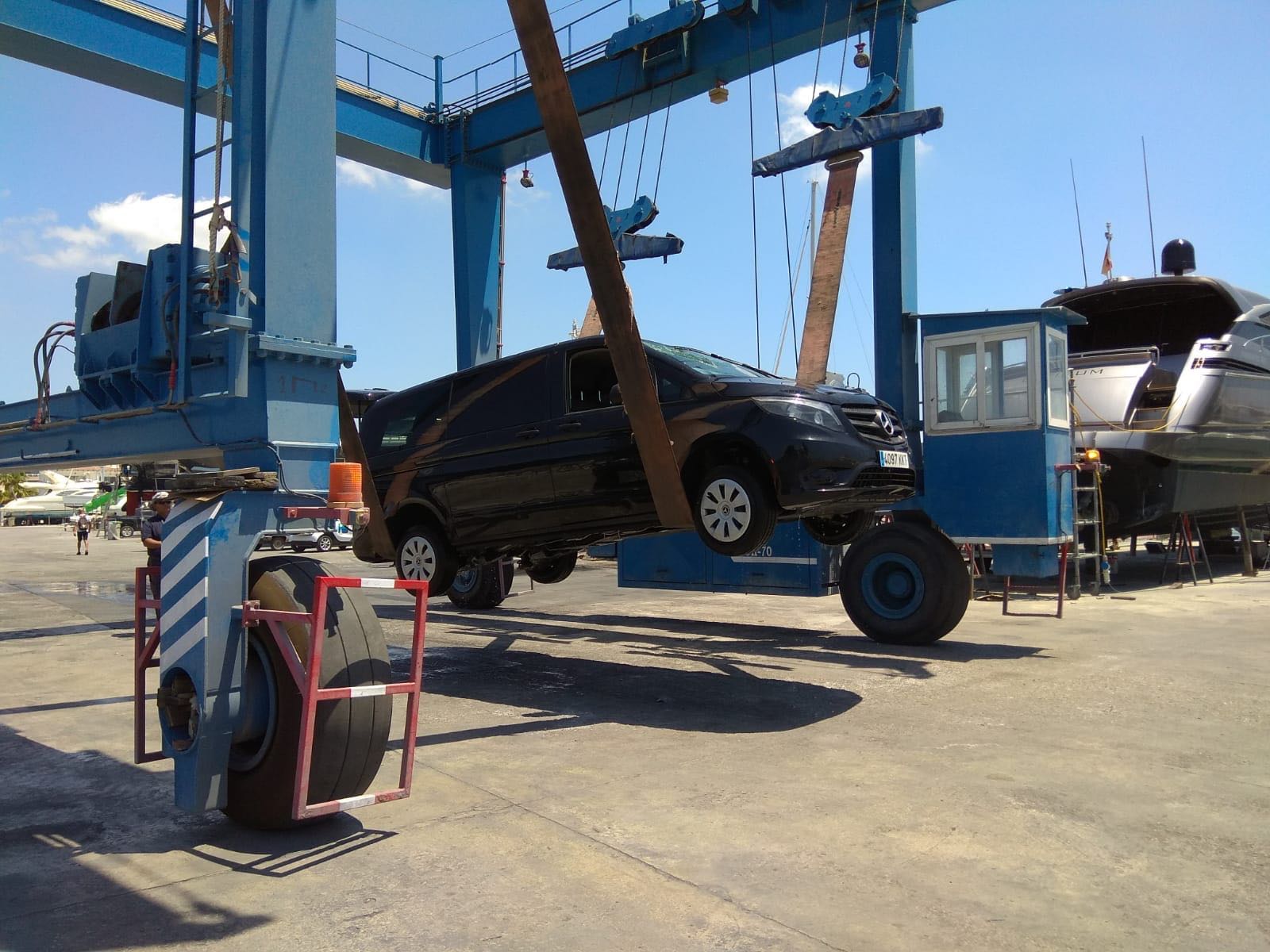 @Noudiari / La furgoneta Mercedes que esta mañana se ha precipitado al mar en un dique exterior de Marina Botafoch ha sido extraída por una grúa. Afortunadamente, no había ninguna persona en el interior del vehículo cuando ha caído al agua.