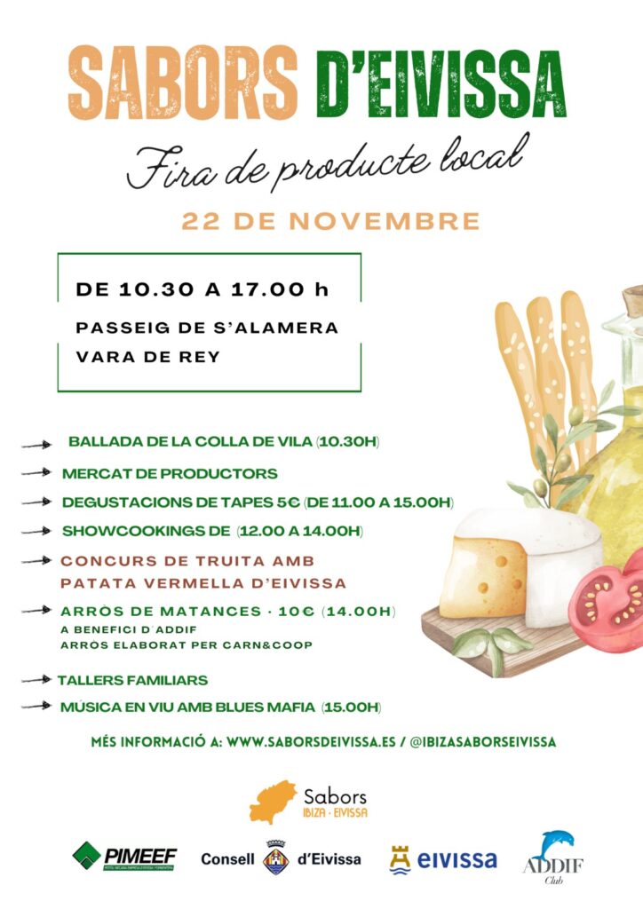 Per completar la jornada gastronòmica, a les 14.00 hores es servirà un arròs de matances solidari a benefici d’ADDIF, elaborat per Carn&Coop, amb un preu simbòlic de 10 €. A partir de les 15.00 hores el públic podrà gaudir d’una actuació en directe del grup Bluesmafia. Aquesta Fira de Sabors ciutat d’Eivissa també compta amb la col·laboració de l’aparcament des Pratet.
