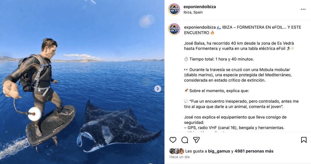 Esta semana ha corrido como la pólvora una imagen subida a Instagram por un creador de contenido que ya había cosechado miles y miles de likes con un vídeo en el que se le ve cruzando de Ibiza a Formentera con una tabla de foil eléctrica. Este acto en sí ya generó una enorme polémica ya que fue analizado como «una temeridad irresponsable» para muchos y como un acto «casi heroico», para otros.